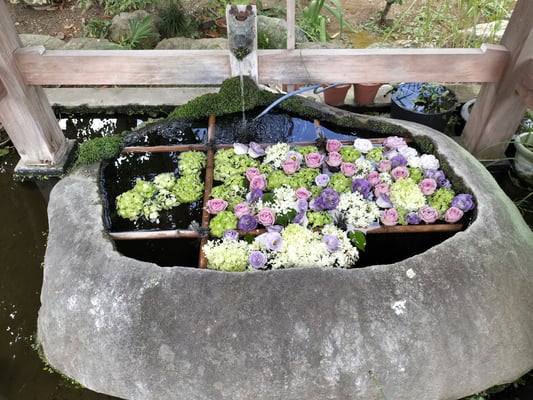 8月の花手水。猛暑の中、少しでも涼を感じて下さい。